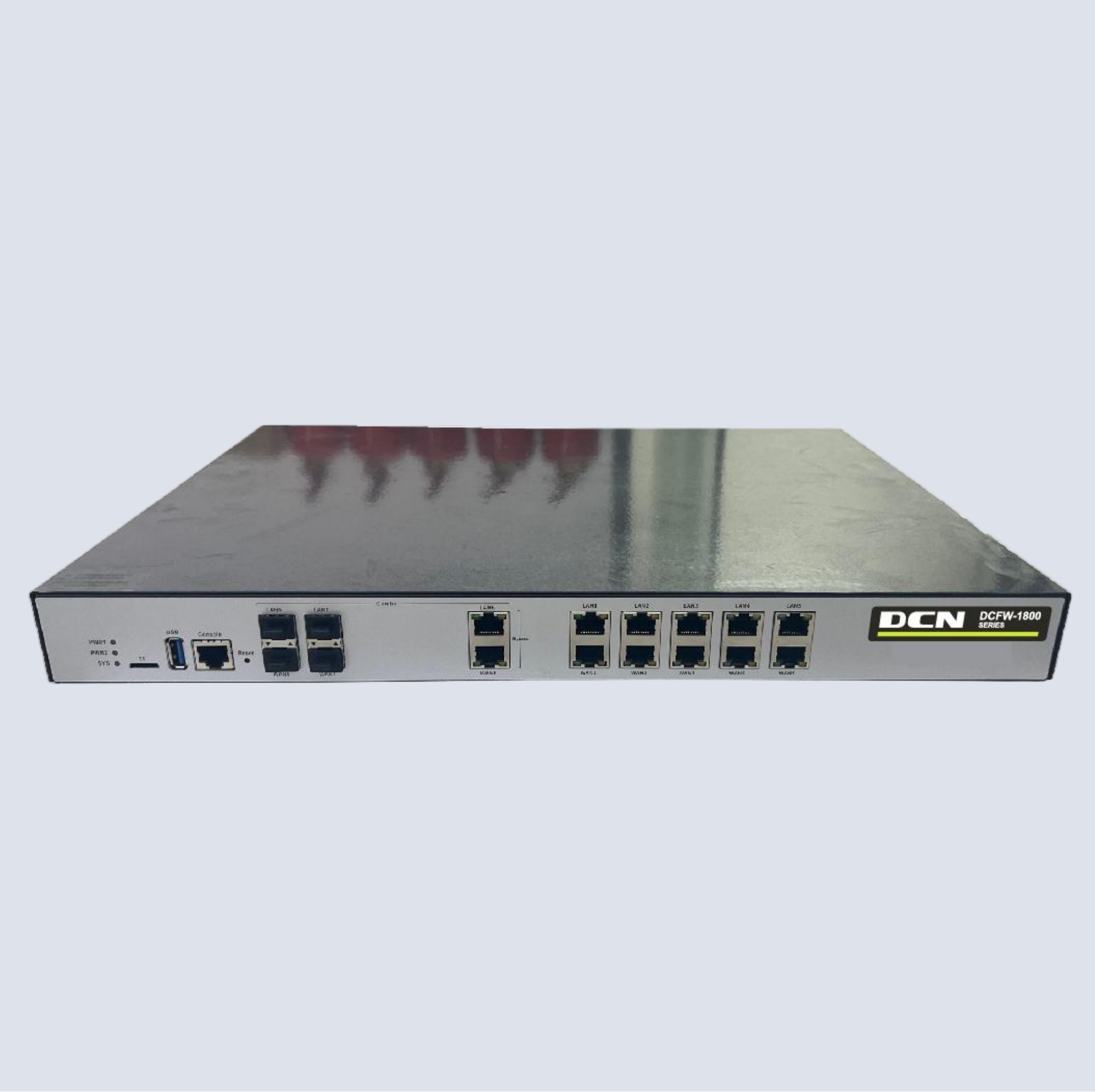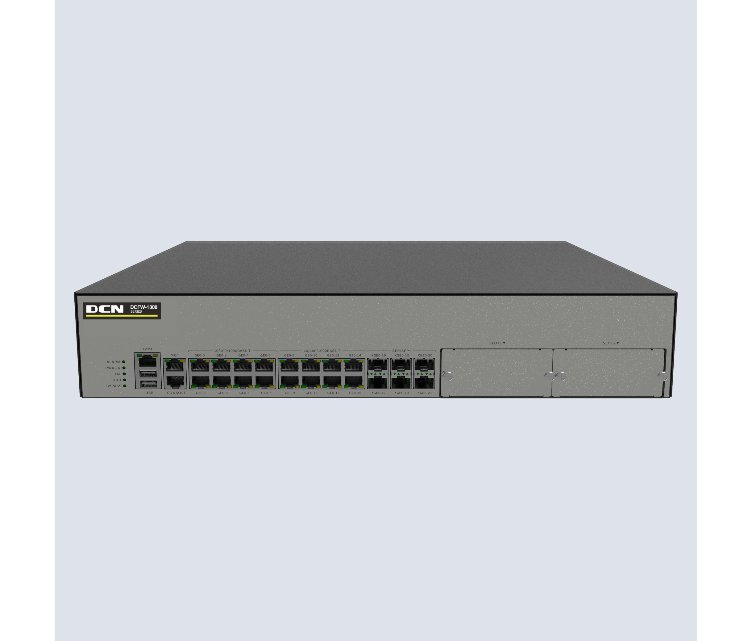 DCFW-1800-H5120 16个千兆电接口,6个万光兆接口,2扩,2U高度,16G内存,19寸机箱,标配1T硬盘,4组bypass,标配双电源,3G带宽;