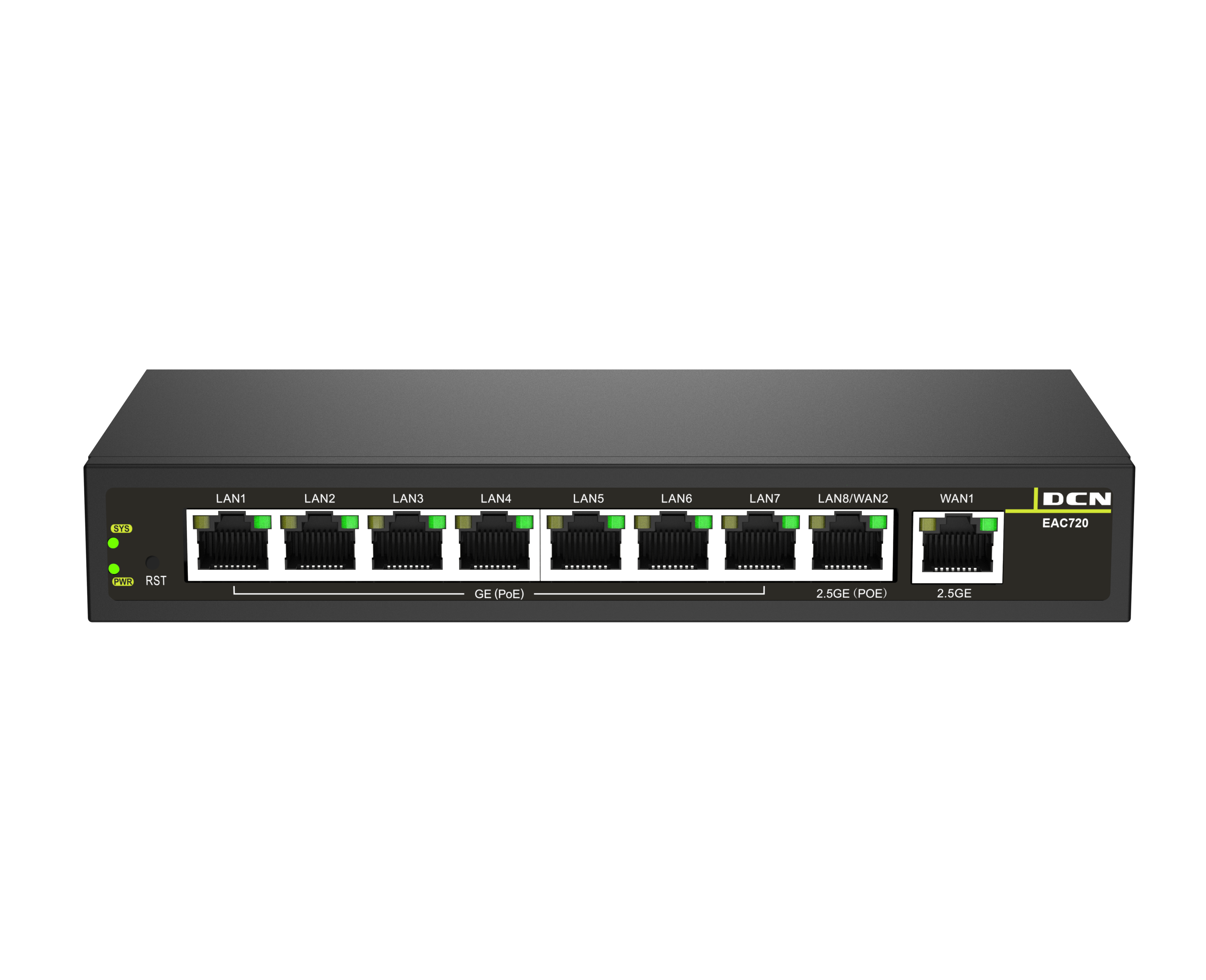 EAC720 POE网关型控制器,支持12.5G WAN端口+12.5G WAN/LAN端口+7个千兆LAN 端口,最大PoE输出功率86W,最大可管理256AP,默认含256AP管理许可,最大出口带宽2.5Gbps,路由场景最大并发终端数200