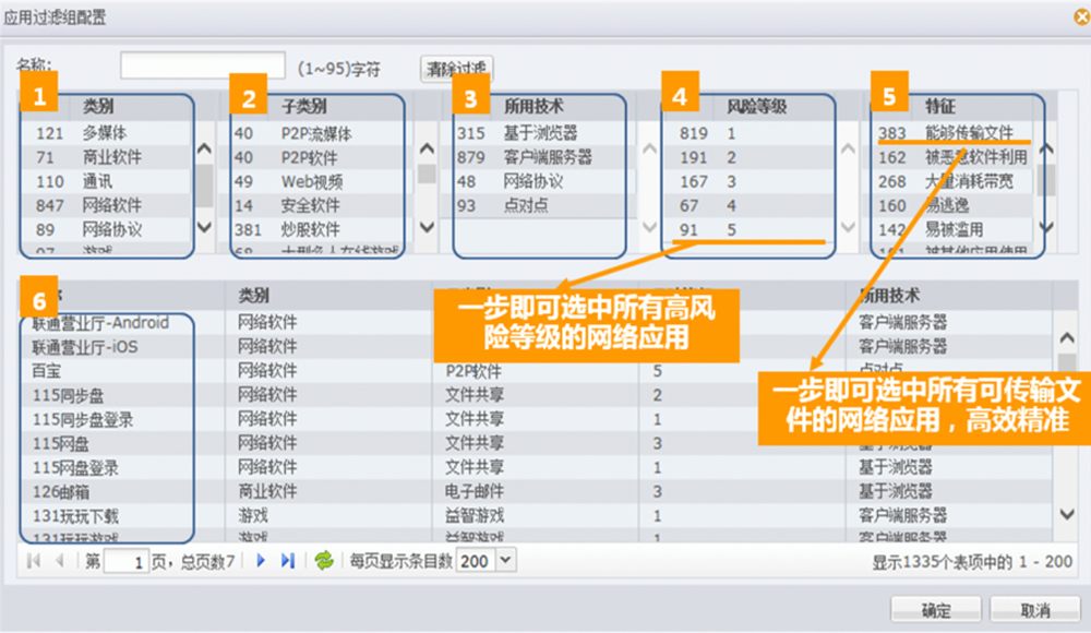 ●精准应用筛选。K8凯发一触即发下一代防火墙给予了精细化的应用筛选机制。用户可根据应用名称、应用类别、应用子类别、风险级别、所用技术、应用特征等6大条件。精确筛选出感兴趣的应用类型,如具备文件传输功能的通讯软件,或存在已知漏洞、基于浏览器的WEB视频应用等等,从而实现精细化的应用管控。