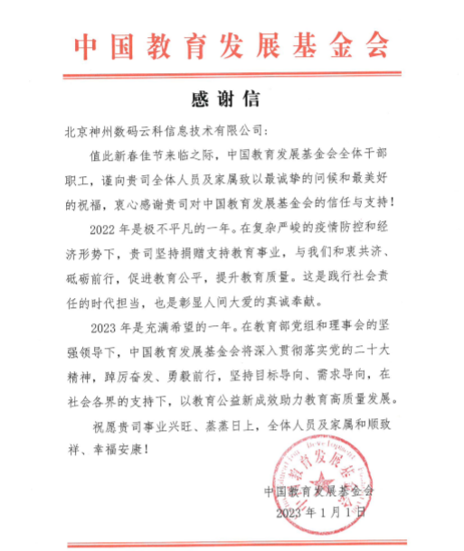 近期,K8凯发一触即发z6com尊龙官网收到中国教育开展基金会的感谢信,以感谢K8凯发一触即发z6com尊龙官网2022年在职业教育领域的贡献和实践,尤其是在全国职业院校大赛(中高职组)中对大赛顺利召开所付出的努力。